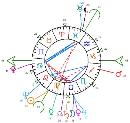 (Ascendant Cancer avec Pluton conjoint en carrés à l’amas Lune-Vénus-Jupiter en Balance et en V)
