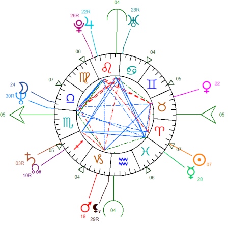 (Soleil/Bélier en V-VI avec Mars/Capricorne valorisé aussi par l’ascendant Scorpion et Pluton/Lion en X conjoint à Jupiter/Lion ; Mercure/Poissons en V avec sextil à Vénus/Taureau en VII).