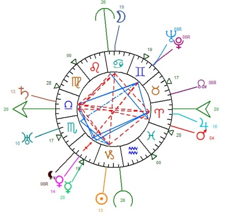 (Ascendant Balance où Saturne exalté est conjoint en XII, recevant le double carré du MC/Cancer et de la Lune ; Jupiter-Mars conjoints au Bélier en VI ; axe Sagittaire-Gémeaux (III-IX) opposé à Pluton-Neptune en Gémeaux en VIII).