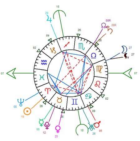 (Soleil-Bélier en secteur I avec Mars/Cancer en IV trigone à Saturne en VIII et carré à la Lune en Vierge en VII ; Amas Taureau plutonisé en II avec Vénus et Mercure)