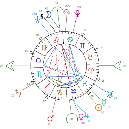 (Soleil-Mercure-Uranus en Poissons en IV et V reçoivent trigone de Pluton-Cancer ; Jupiter maître des Poissons au Verseau en IV est conjoint à Vénus maître d’ascendant Balance ; Neptune autre maître des Poissons est au Lion en X.)
